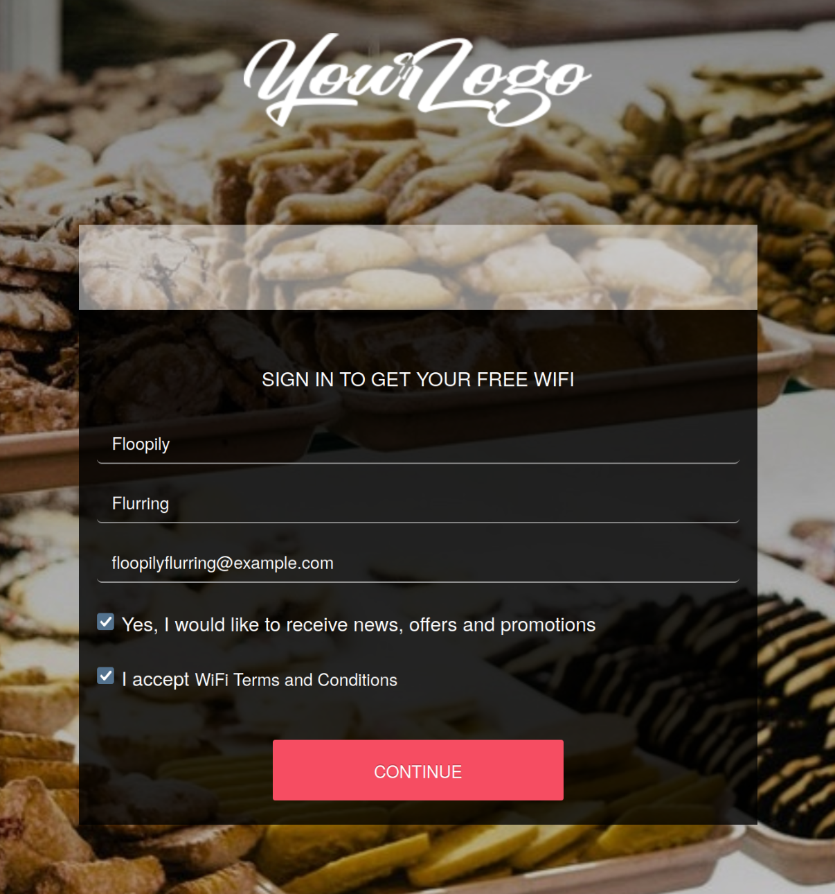 To connect to the WiFi, enter your details and accept the WiFi terms conditions, and then click CONTINUE: