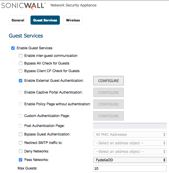 With SonicWall, guests are sent to the Fydelia server and the redirect includes all SonicWall parameters required by Fydelia. In fact, for this reason, there is no configuration required at all on the Fydelia splash page side.